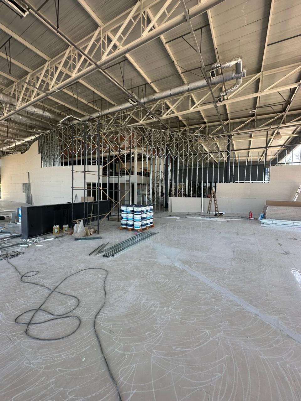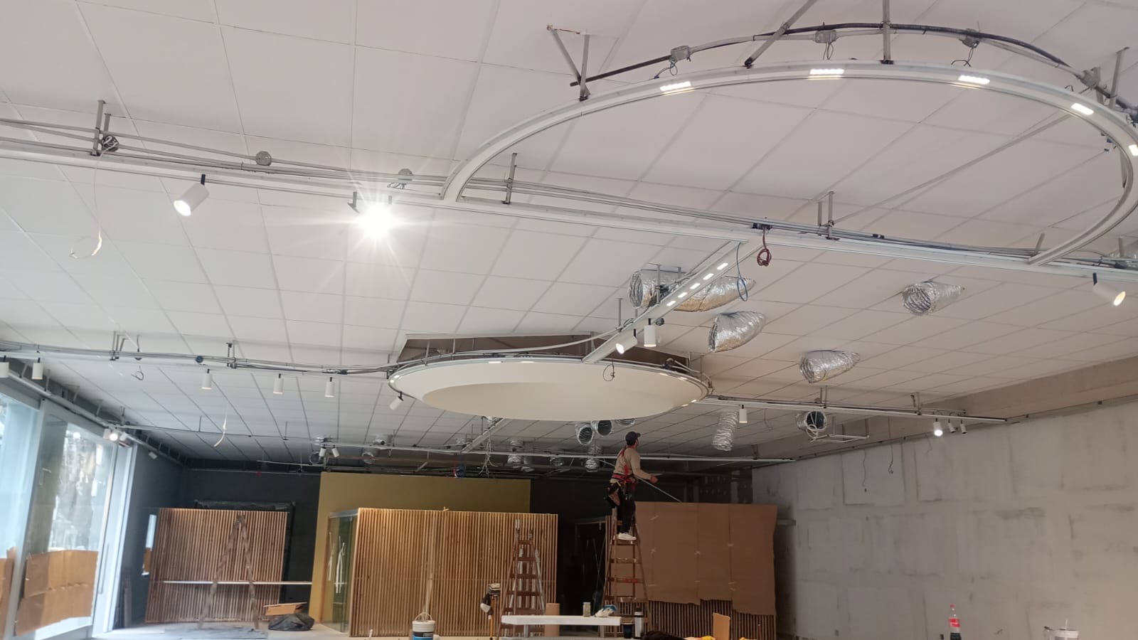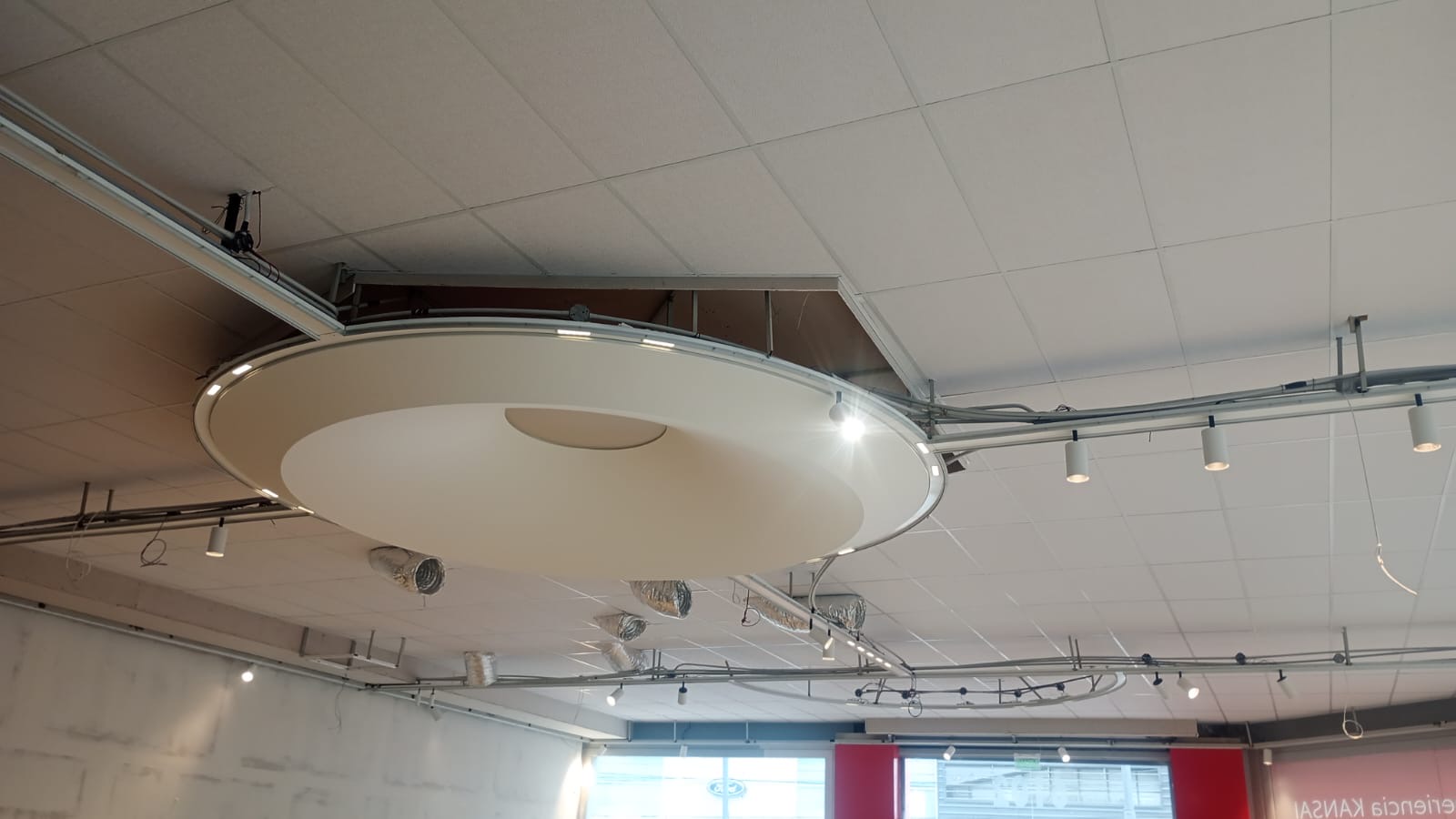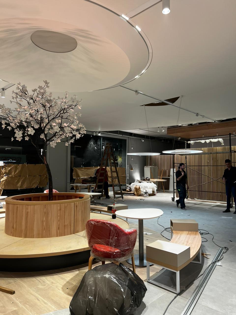 Realizamos el cielorraso de la nueva concesionaria BYD en Parque Leloir con sistema de construcción en seco. Se construyó una estructura que replica la geometría del piso y sostiene telas tensadas de distintas texturas.